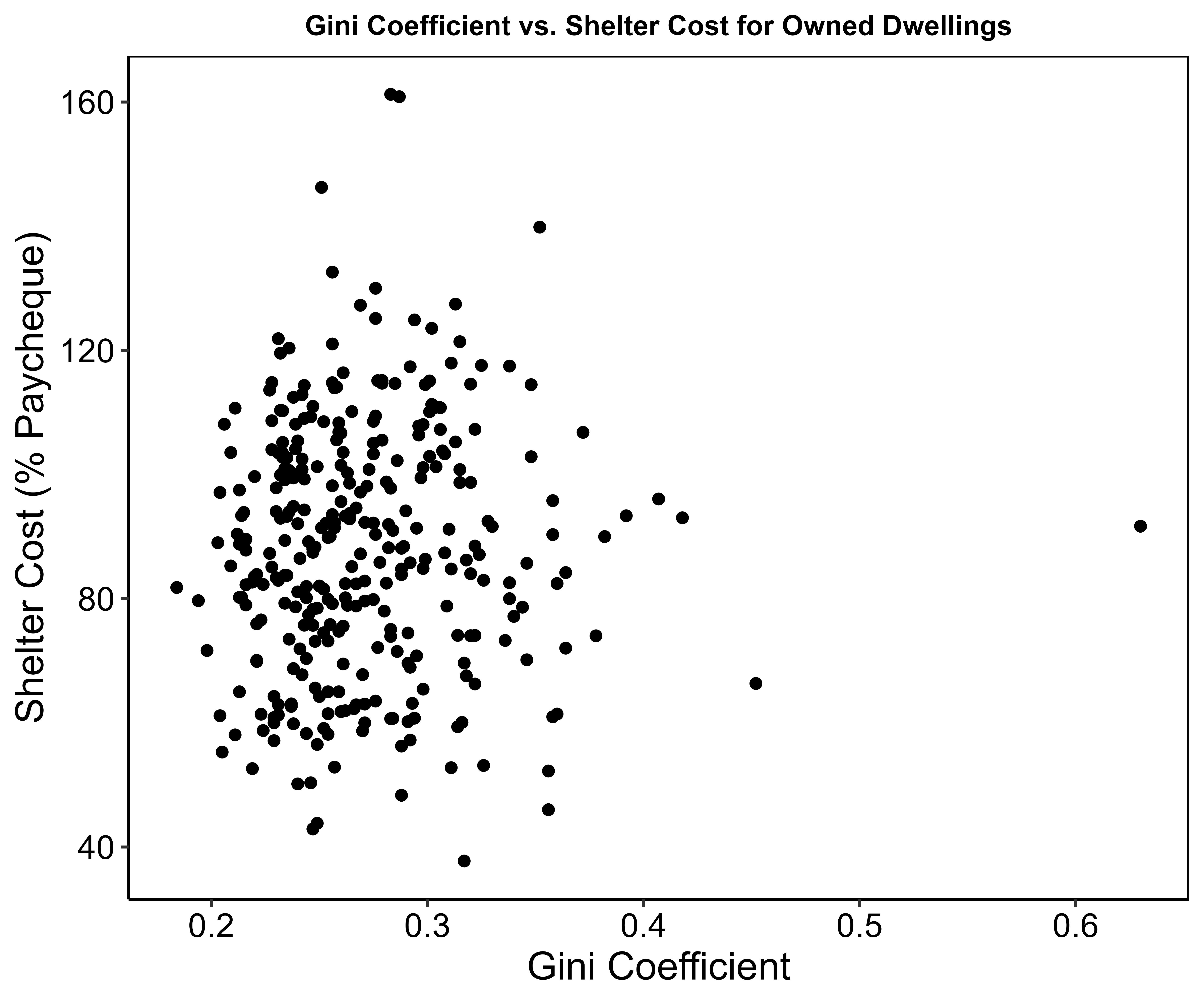 While the effect is not as notable as the low-income measure, we still see a clear skew to the right, which is once again a cause for concern. The more economic inequality that a DA has, the more its residents are affected by shelter cost, indicating that economic inequality exacerbates the housing affordability crisis. It’s also worth mentioning that we did not remove that outlier point that has a Gini coefficient greater than 0.6 because it does capture meaningful economic inequality within that DA, which consists of a mix of regular-sized houses and sprawling mansions.