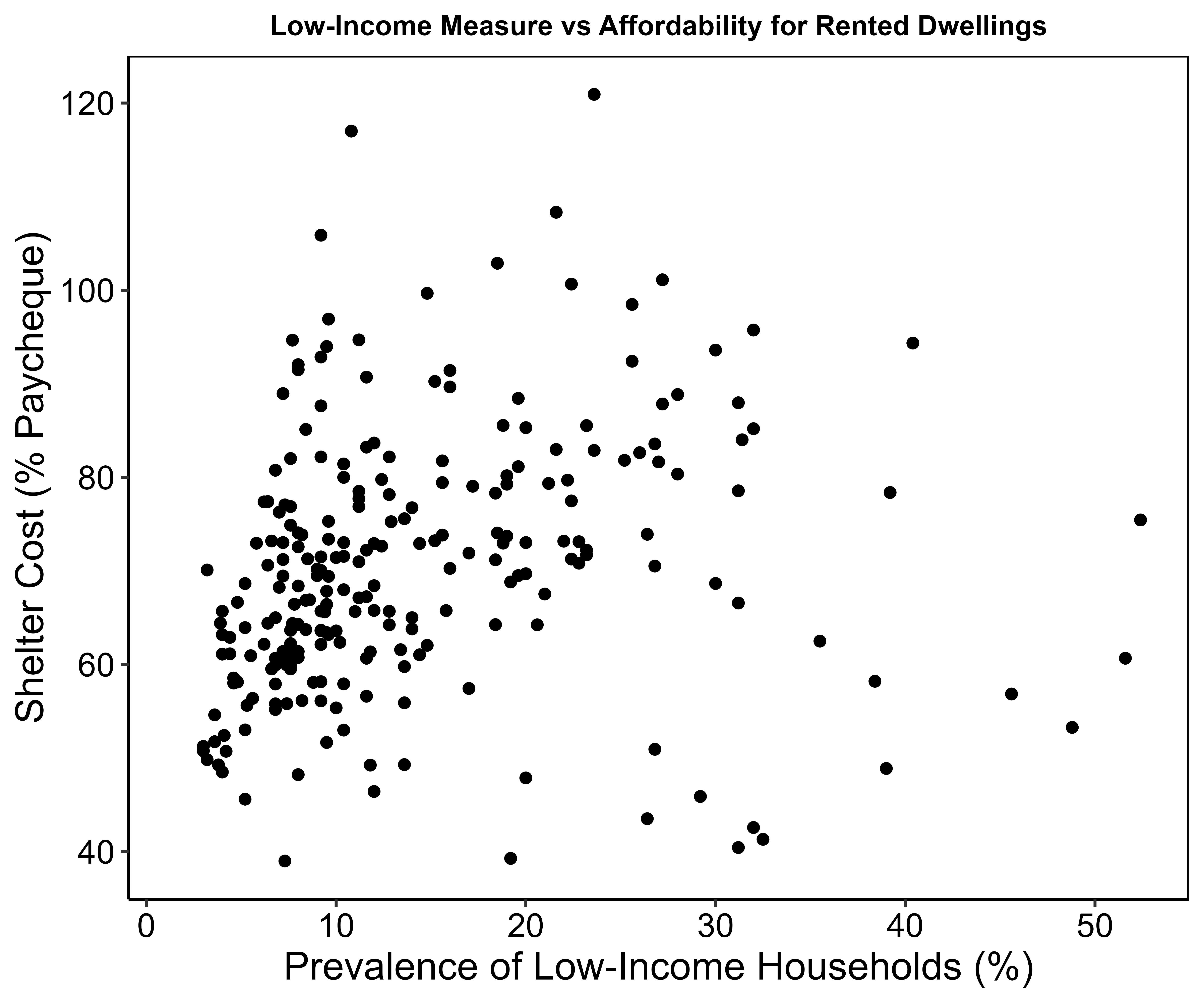 We determined rental affordability across the DAs in the region and correlated that with the presence of low-income households in each DA (as a percent of all households in the DA). While we also performed these analyses for cost of owned shelters (see appendix), we are presenting cost of rented shelters because people in precarious economic circumstances tend to rent rather than own a place.