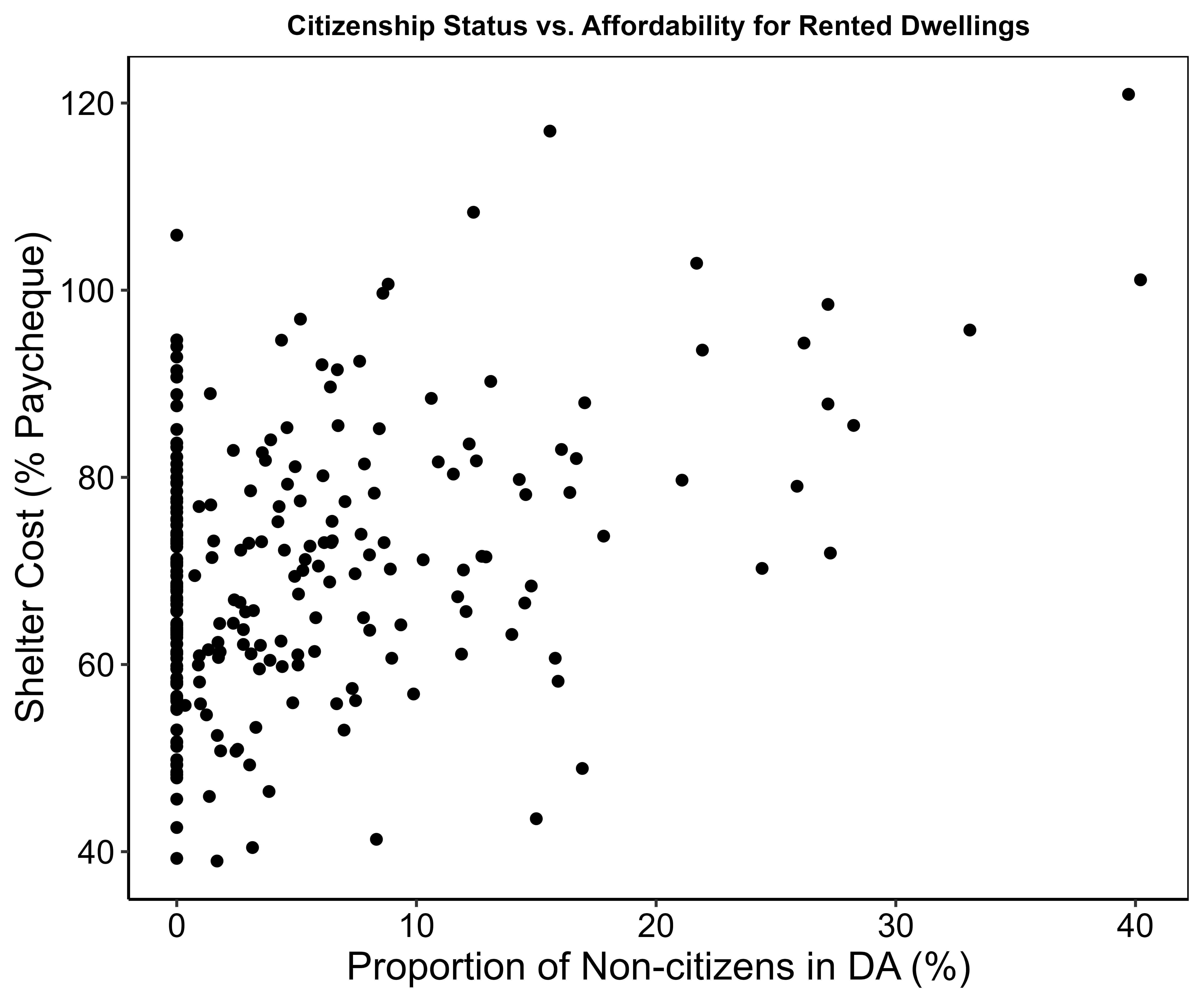 A liberal democracy should aim to treat all residents equally, including non-citizens. Stats Canada defines it’s ‘not citizen’ measure as residents who were either permanent or non-permanent residents at the time of census survey. We plotted the presence of non-citizens in each DA against affordability of rented shelters: