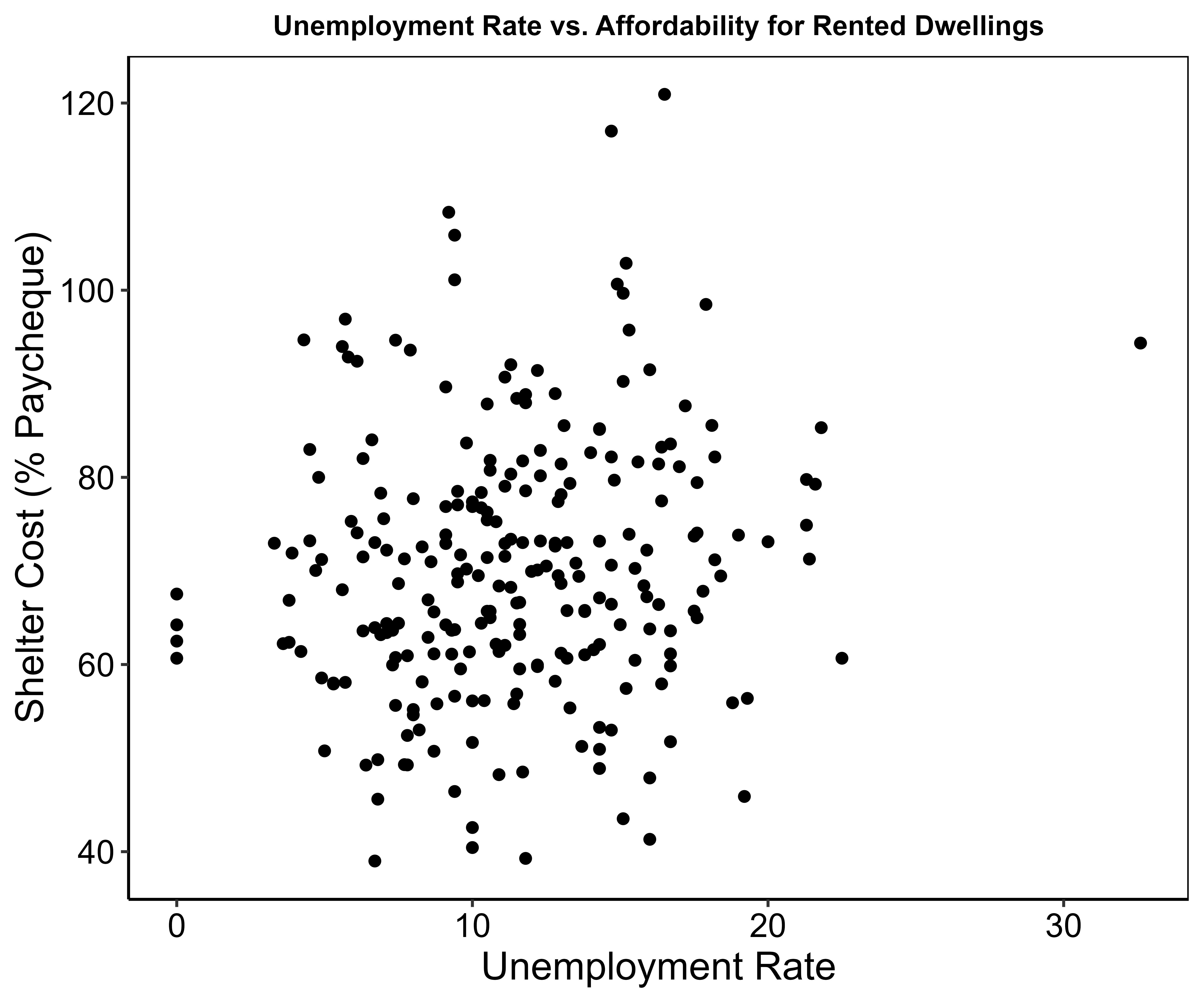 Unemployment rate is another measure of economic precarity, as regions with higher unemployment rates tend to be more affected by cost increases. In addition, lack of employment could potentially underlie the greater shelter costs we saw in previous analyses. To investigate further, we plotted each DA’s unemployment rate against its rental affordability: