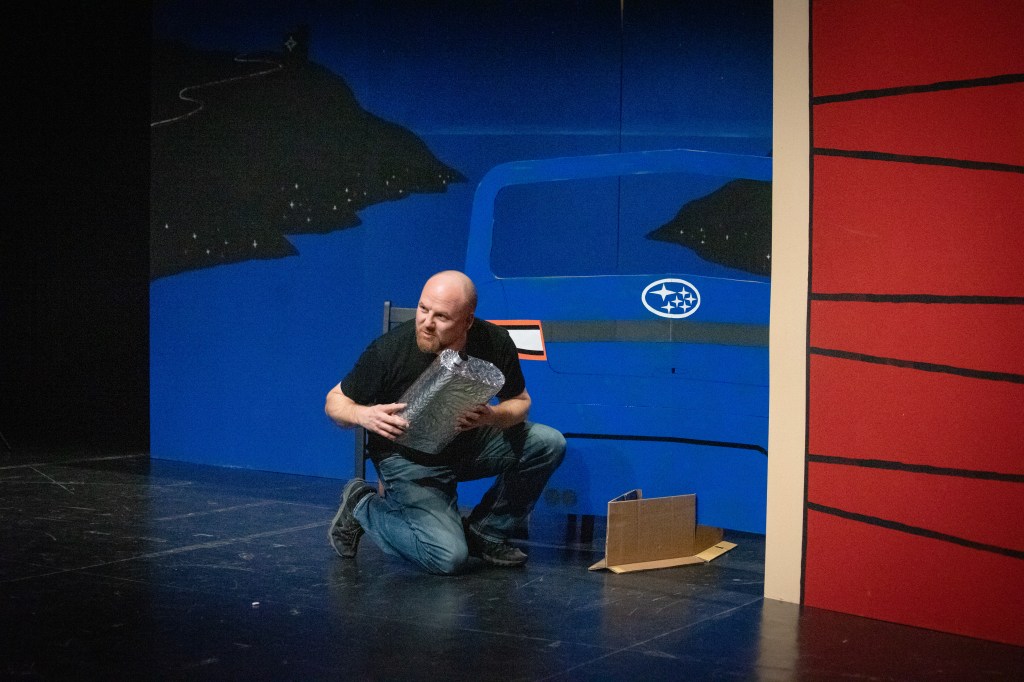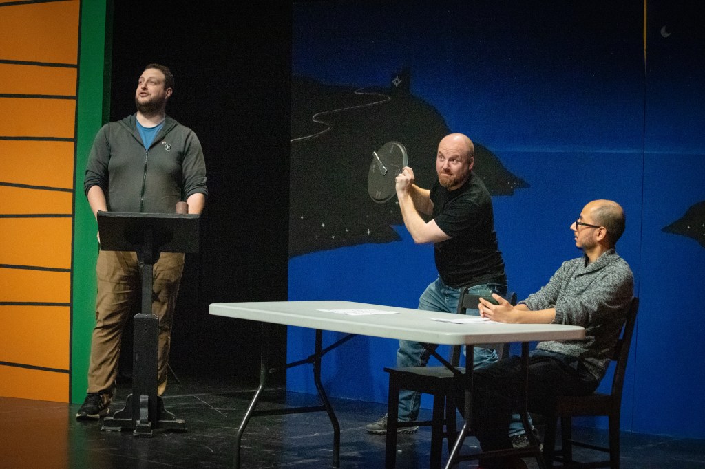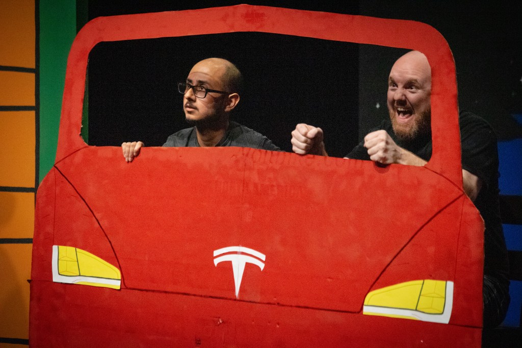 Our sketches ranged across urban advocacy topics. Our first scene made fun of the ‘one more lane’ philosophy seen across North America, where poorly planned car-first infrastructure simply resorts to adding more when capacity issues arise, rather than engaging with sustainable solutions. Then, we moved right on to a scene about an eager junior planner watching their excitement turn to frustration as city council votes against important and useful proposals while accepting ones that have no or negative impact. Finally, we finished off the set with a scene about a transit desert, in which a genie (which appeared following us rubbing a muffler) granted us three wishes as long as they did not infringe on the will of the free market. To our massive surprise, the crowd actually laughed – several times!